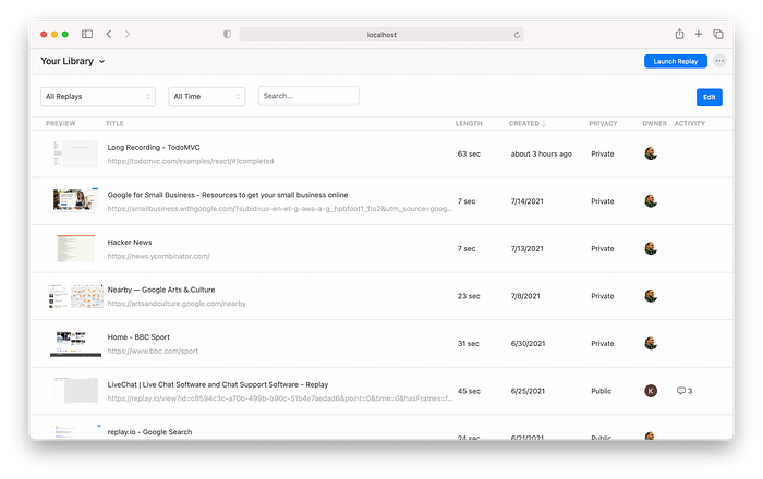 Over at replay.io, we’re creating a new way to understand your software and fix bugs by recording the execution so you can play it back, debug it, and share it with others. Once you try it, you’ll create a bunch of recordings and so you’ll need a Library view to manage them.
